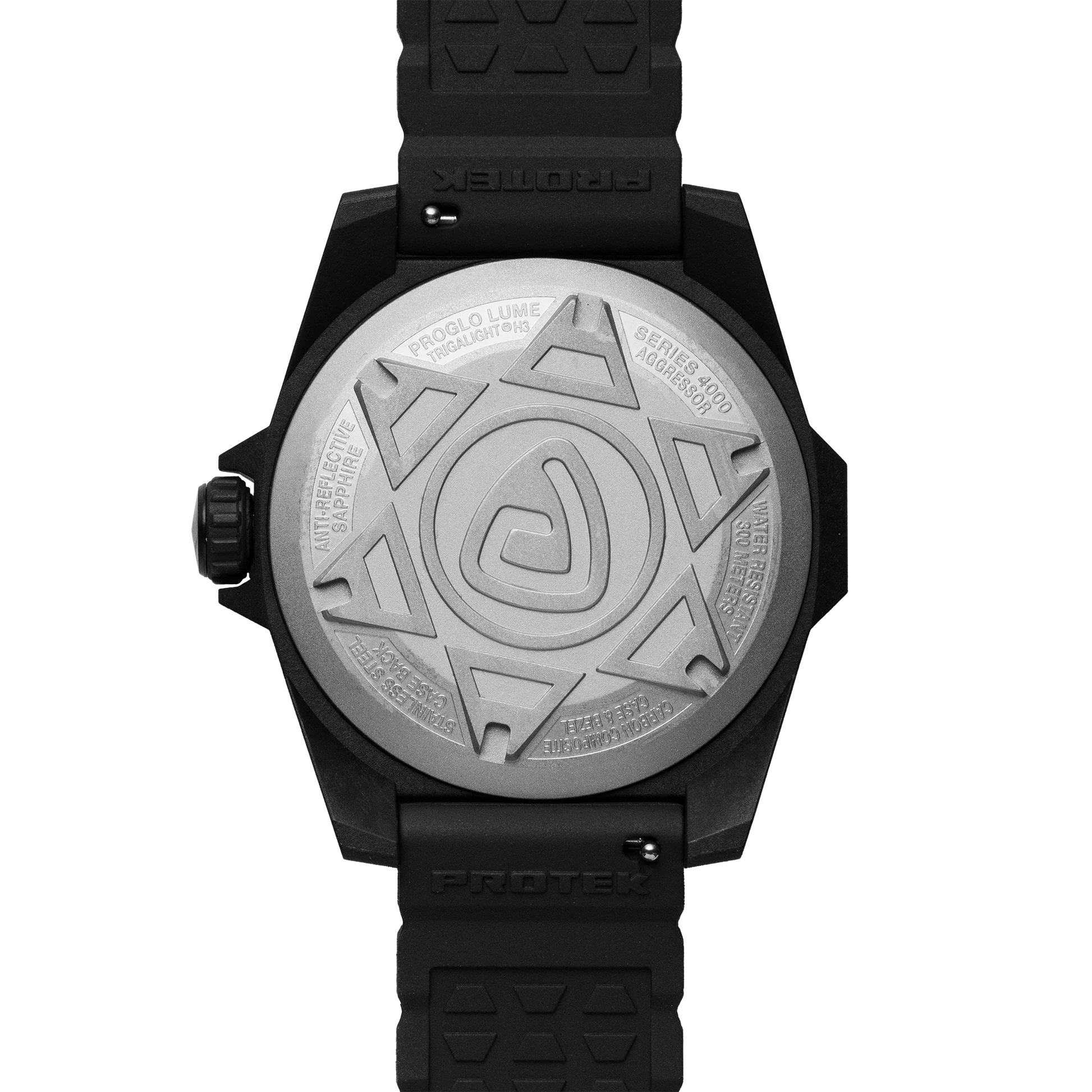 The Model PT4007 Aggressor combines tactical precision with refined engineering. Its 45mm carbon composite case houses a robust 316L stainless steel construction, featuring a screw-in crown with multiple O-rings and an embossed caseback. The unidirectional 60-click dive bezel and sapphire crystal with antireflective coating ensure clarity in demanding conditions. Powered by a dependable Japanese Citizen/Miyota quartz movement with a 4-year battery, this timepiece delivers reliable 3-hand timekeeping. The Swiss Pro-Glo T100 self-powered illumination system provides continuous visibility for 25 years—100 times brighter than standard lume. Water-resistant to 300 meters and paired with a genuine rubber strap (22mm) featuring a quick-release steel buckle, the Aggressor balances durability with sophistication. Weight: 82 grams.